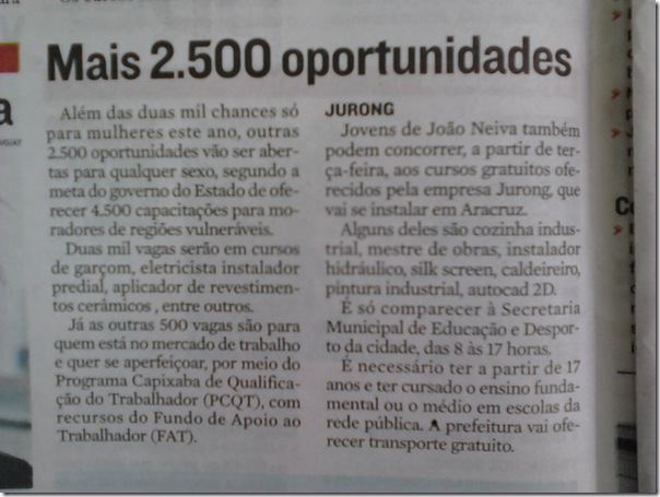 As denuncias contra os métodos de seleção para os cursos oferecidos pela JURONG ganham força e destaques na mídia após denuncias feita em primeira mão pela a Ong Amigos da Barra do Riacho e demais instituições da Orla de Aracruz. É uma vergonha, já vincula nas redes sociais que as provas que ocorreria no dia 26 de Fevereiro ocorram em 11 de Março de 2012, mostrando assim uma medida desesperadora para buscar uma alternativa para tentar mascarar o desrespeito as nossas comunidades da Orla de Aracruz que só ficam com prostituição, trafico, assaltos, falta de lazer, emprego, saúde, segurança e muitos outros pontos, vejam até a policia esta levando bala!!!!!!!!! Não temos recursos hídricos na região para atender, nós mesmos, quanto mais empresas de grande porte como a JURONG, mas não se preocupe nossos rios serão desviados para os grandes empreendimentos, há também não se preocupe com a qualificação profissional já serão qualificados os profissionais para atender a JURONG, SIM SERÁ, os moradores de João Neiva apadrinhados por força politica do município juntamente com Fundão, Ibiraçu e Praia Grande, que nem de perto sofrerá os impactos diretos que sofrem nossas comunidades da Orla, principalmente Barra do Riacho. Como consta no PDM do município O JURONG ARACRUZ, encontrasse dentro do perímetro de Barra do Riacho que faz divisa no rio de Barra do Sahy na a proximidade da cabana do Pedro Black, em outras palavras o Estaleiro esta dentro de Barra do Riacho, como os demais empreendimentos gigantescos da região e mais uma vez, se não reagirmos, seremos roubados e desmoralizados por empresas que não tem coração e respeito pelo ser humano. Os argumentos são os mesmo que não temos mão de obra qualificada, porem quando a empresa tem que cumprir sua responsabilidade de condicionante a mesma não faz. Porem nos chega denuncias que a empresa vem contratando pessoas de cargos de confiança de prefeituras da região e as mesma beneficiam seus munícipes, essa pratica é antiga em Barra do Riacho um exemplo é a Tec-Vix, é de conhecimento de todos, que um ex- funcionário da empresa que seria pré candidato a Vereador em João Neiva, favorece recrutamento do pessoal desse município. A influencia de Jõao Neiva nos empregos da Orla de Aracruz é assustador, já há rumores que na JURONG será da mesma forma já que existem pessoas de confiança daquele município na JURONG. Como diz Boris Casoy Isso É UMA VERGONHA!!!!!!!!!!!